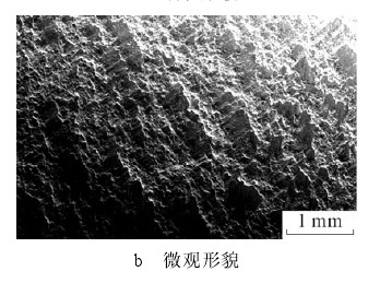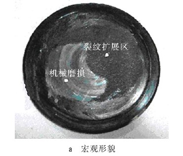 2.1.1 軸斷裂面宏觀及微觀形貌觀察 軸斷裂面處于軸上軸承安裝處的過渡圓弧區(qū)域(軸承安裝根部)。圖 1 為斷軸宏觀斷裂面,局部發(fā)生磨損,斷口表面齊整與軸向垂直,無縮頸和塑性變形痕徑。斷口疲勞條帶明顯,從外圓向中心擴展,最終瞬斷區(qū)面積小于軸截面積的 10%,說明斷軸所受名義應力較小。