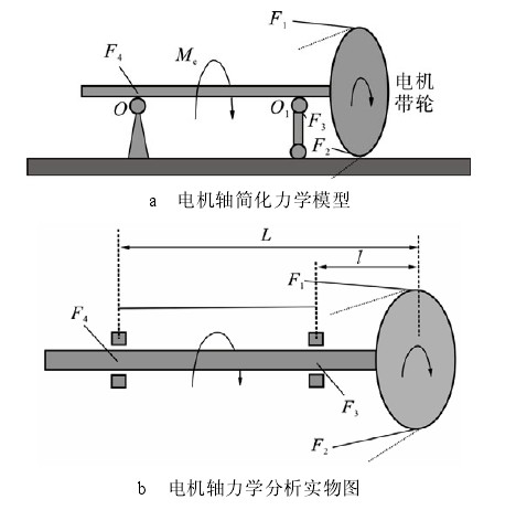 2.2 電機軸力學計算分析由于電機軸為階梯軸,不同階梯截面處承受的力矩和應力是不同的。電機運行時軸受到彎扭力矩的共同作用,如果某一階梯截面承受應力過大,則可能最先在階梯截面過渡圓弧處萌發(fā)裂紋和發(fā)生斷裂,因此找出電機軸受力危險截面,對判斷軸斷裂原因有重要作用。電機軸力學分析簡化模型如圖 4 所示。圖中,F(xiàn)1、F2為皮帶張緊力;F3、F4為電機軸支撐力;Me為電機轉(zhuǎn)矩;O 與O1為電機軸支撐點;F 為皮帶張緊力 F1與 F2的合力;T 為 O1支撐點承受的彎矩;D 為電機軸分析截面直徑;M 為分析截面對應扭矩;L 和 l 分別為電機左端軸承距右端軸承及電機帶輪的水平距離。