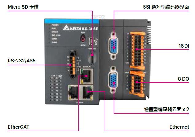 ● 內(nèi)置6?~?16 DI?/?6?~?8 DO、增量型編碼器、SSI絕對型編碼器、RS-232/422?/?485、Ethernet與EtherCAT等界面
